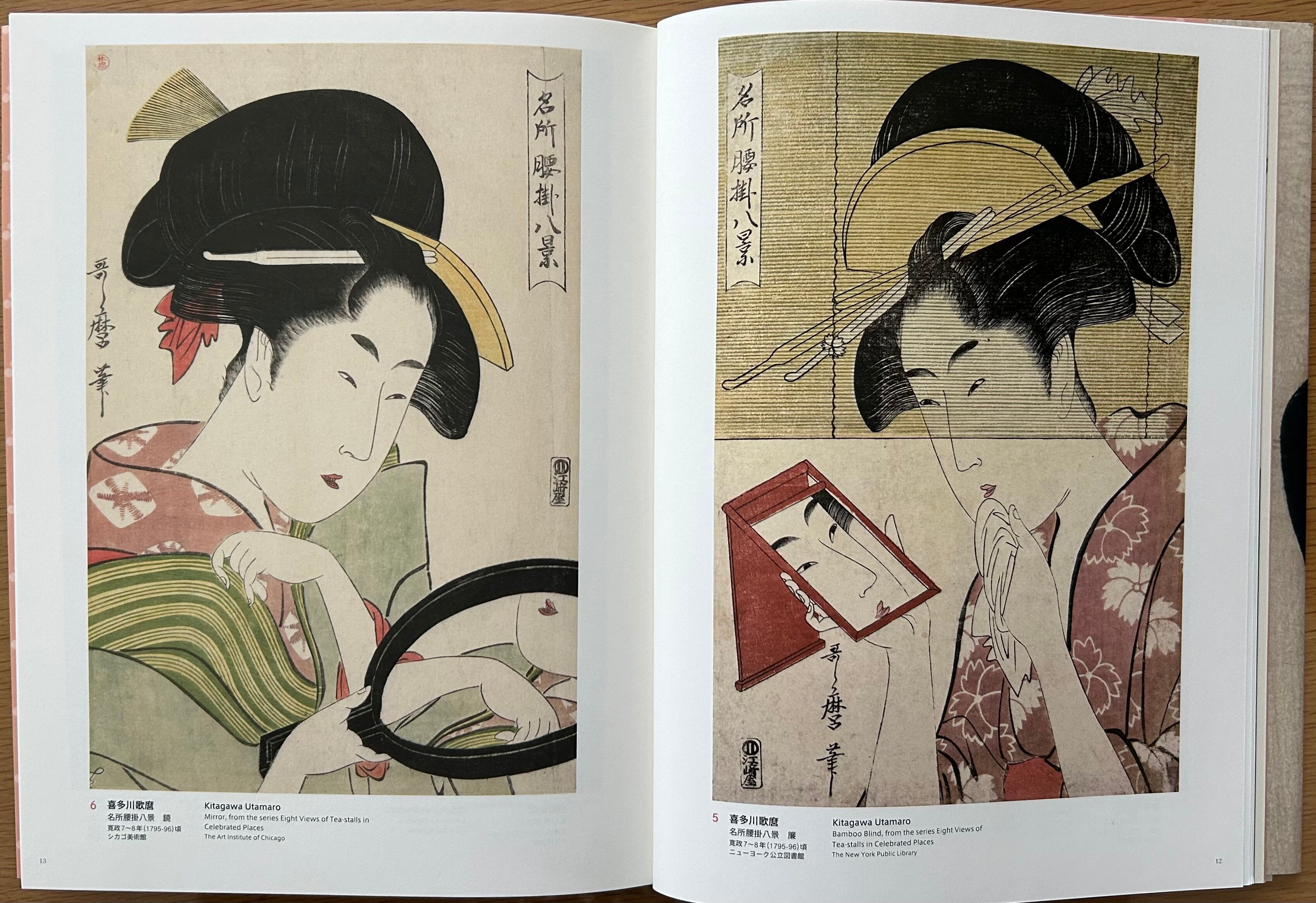 化粧をするため、髪を結うため、鏡を見つめる女性たちの表情はとても真剣で、浮世絵師はその様子を捉えようと試みています。