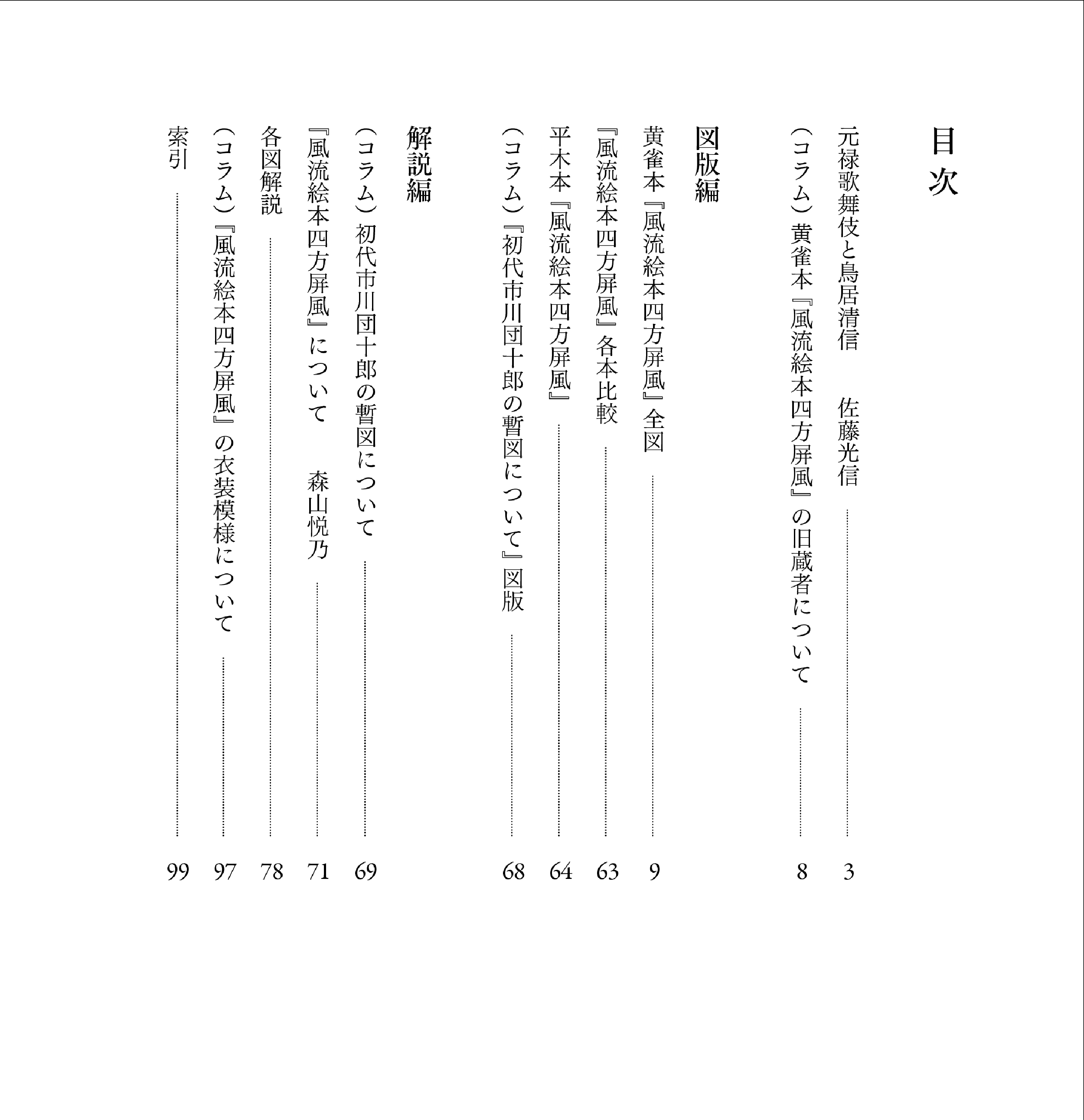 元禄13年(1700)に刊行された初代鳥居清信による『風流絵本四方屏風』は、平木浮世絵財団、ボストン美術館、黄雀文庫本にのみ現存する貴重本です。